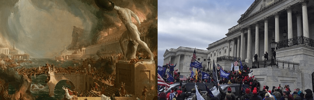 L’histoire illustre bien cette détérioration entropique. Comme les êtres vivants (qui sont dans le fond des systèmes biologiques), toutes les entités politiques ont une durée de vie, et bien que celle-ci puisse être longue, bien qu’elle puisse s’estomper doucement dans le temps ou souffrir le choc d’une fin violente, cette vie prend fin. Les empires les plus puissants et les plus éblouissants tout comme les parenthèses éphémères de l’histoire ont tous fini par disparaître dans l’ombre du temps et il n’y a pas actuellement aucun pays qui soit restée inchangé, c’est-à-dire insoumis aux pressions entropiques, depuis le début de son histoire. Le fait même qu’il y ait un début veut dire qu’il a dû y avoir une fin qui l’ait précédé. Rien ne permet donc de croire de façon dogmatique, comme beaucoup d’américains semblent le faire grâce a une mythification idéaliste du rayonnement et de la puissance de l’Amérique, que nous sommes à l’abri d’un scénario dans lequel l’entropie puisse atteindre un niveau qui pourrait éventuellement avoir raison de notre système. Ce pays a traversé des belles époques (même si celles-ci n’étaient pas « belles » pour tout le monde)  mais ces étapes, les étapes de stabilité du système, semblent malheureusement (ou heureusement) être derrière nous. Le système continuera certes à fonctionner pendant quelque temps, mais il continuera aussi sa longue marche entropique vers la mutation ou la désintégration. Au XIXe siècle on parlait du destin manifeste de l’Amérique à étendre ses frontières vers l’ouest, une idée qui exprimait une certaine idéalisation de la propagation du progrès. Ce destin comporte peut-être aussi la décadence tel un corps qui vieillit. Chaque jour qui passe, les fissures qui étaient déjà apparentes il y a un nombre d’années, s’ouvrent de plus en plus et deviennent des gouffres béants qui semblent toujours plus infranchissables.